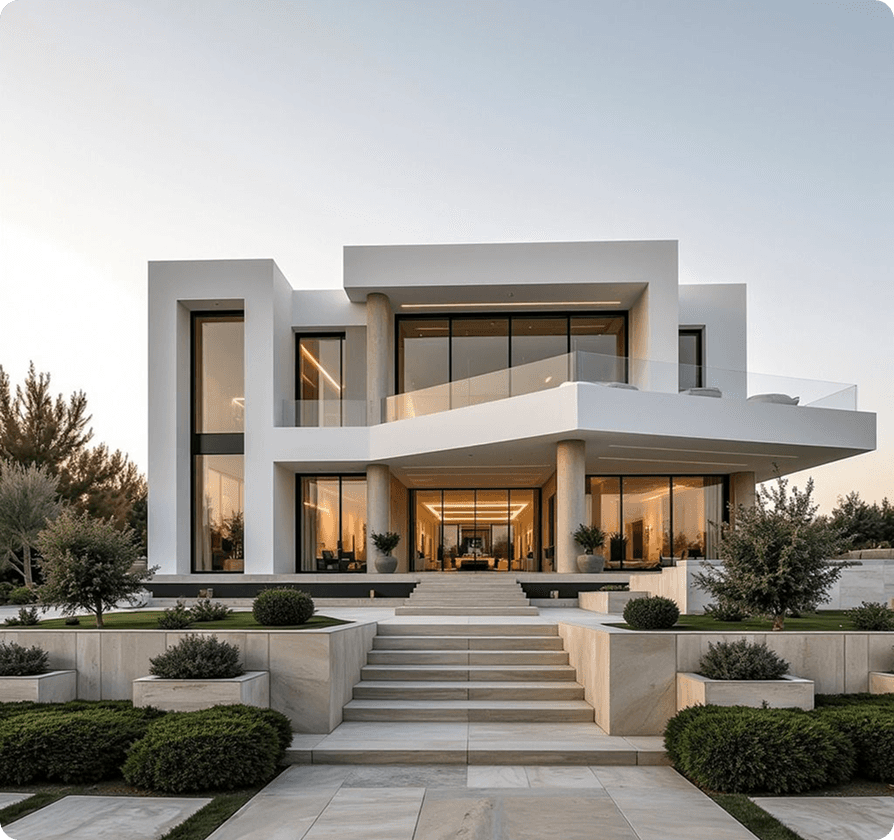 A sleek 4-bedroom minimalist home with floor-to-ceiling windows, open-plan interiors, and an infinity pool. Ideal for coastal or hillside locations.